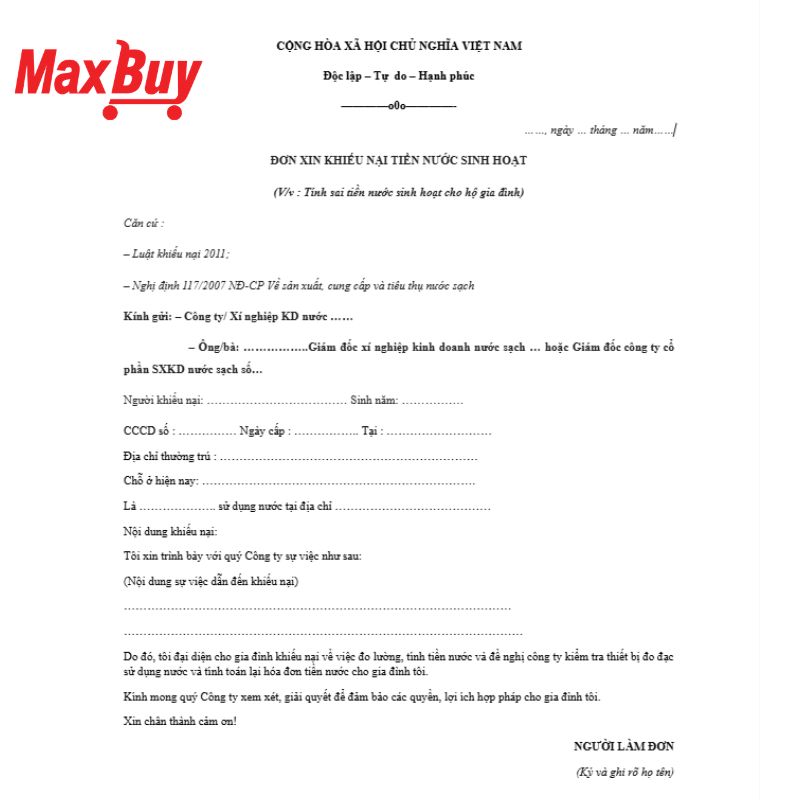 ĐƠN XIN KHIẾU NẠI TIỀN NƯỚC SINH HOẠT