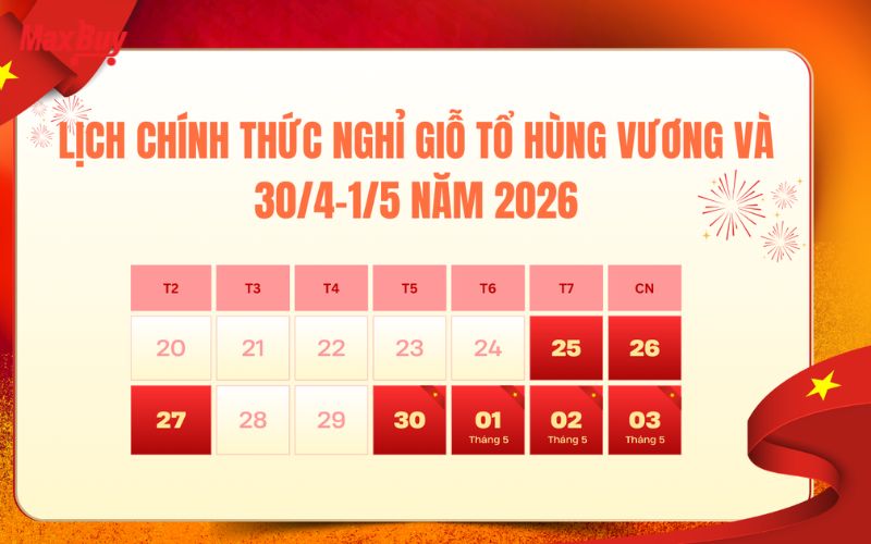 Hy vọng với những thông tin chi tiết về lịch nghỉ lễ Giỗ Tổ Hùng Vương, 30/4 - 1/5 năm 2026, bạn đã nắm rõ được số ngày nghỉ và cách sắp xếp công việc hay kế hoạch cá nhân hợp lý. Đừng quên thường xuyên truy cập website Maxbuy để cập nhật đầy đủ các tin tức, lịch nghỉ lễ mới nhất cùng nhiều thông tin hữu ích khác cho người lao động, học sinh và sinh viên trên toàn quốc.