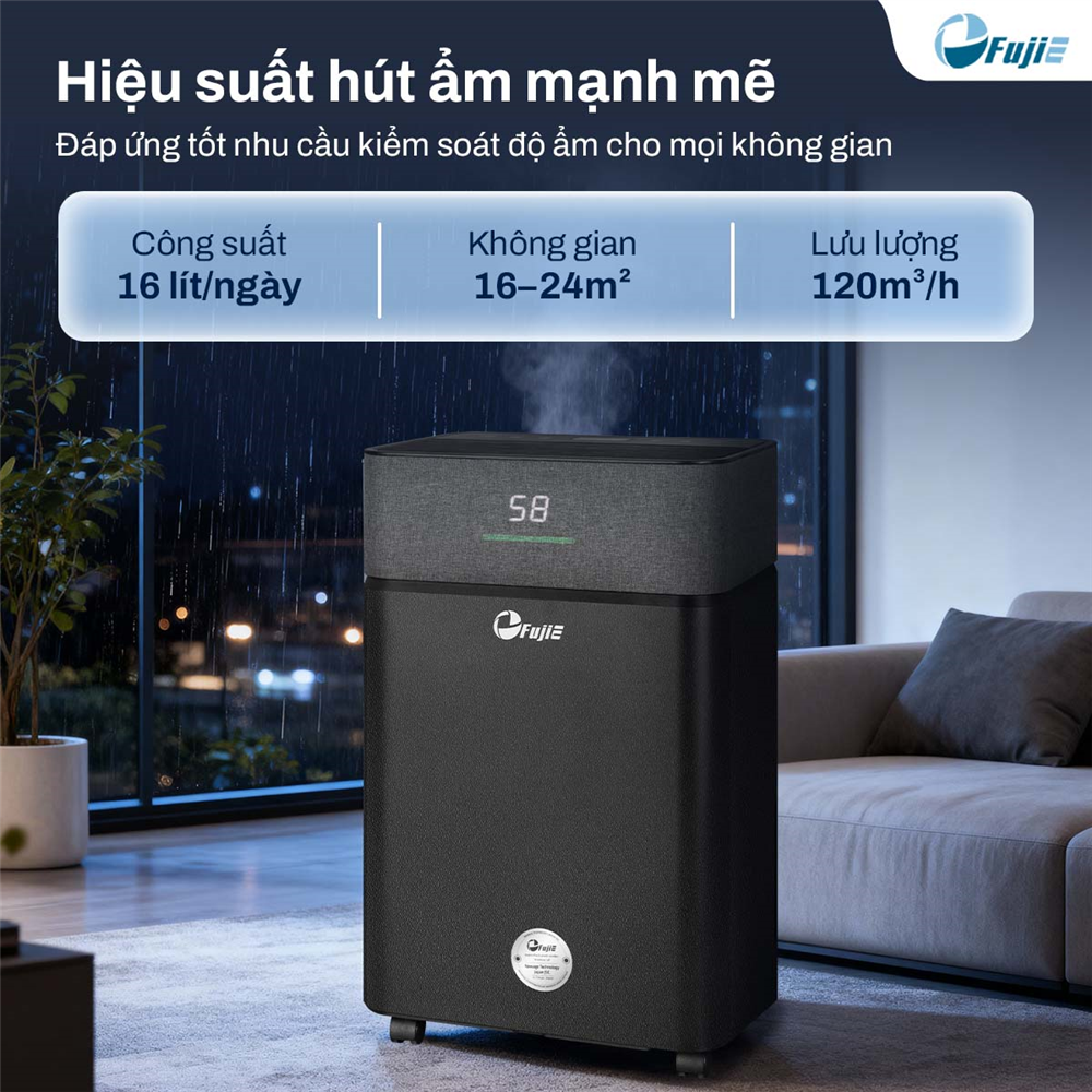 Với công suất hút ẩm 16 lít/ngày trong điều kiện lý tưởng (30°C, 80% RH), FujiE HM-916ED đáp ứng tốt nhu cầu kiểm soát độ ẩm cho không gian từ 16–24m², như phòng ngủ tiêu chuẩn, phòng khách nhỏ, phòng thay đồ.