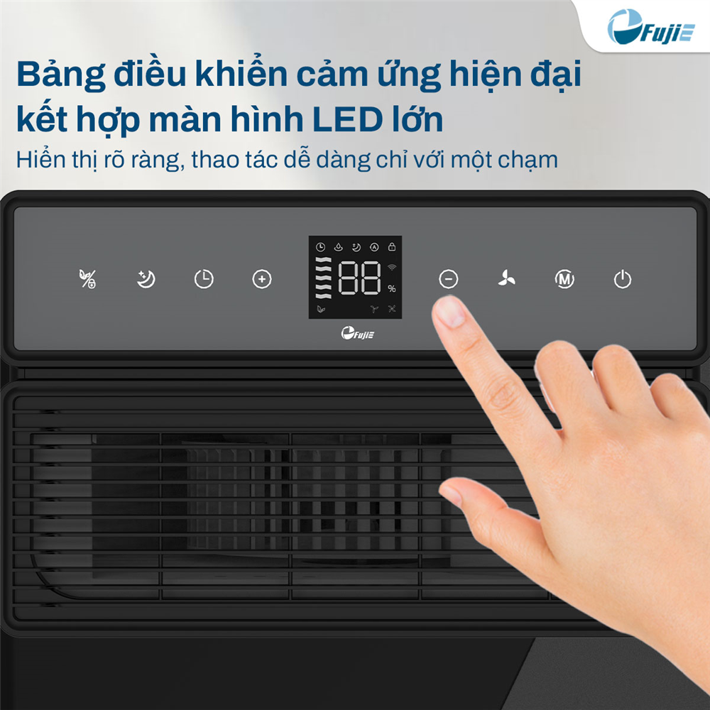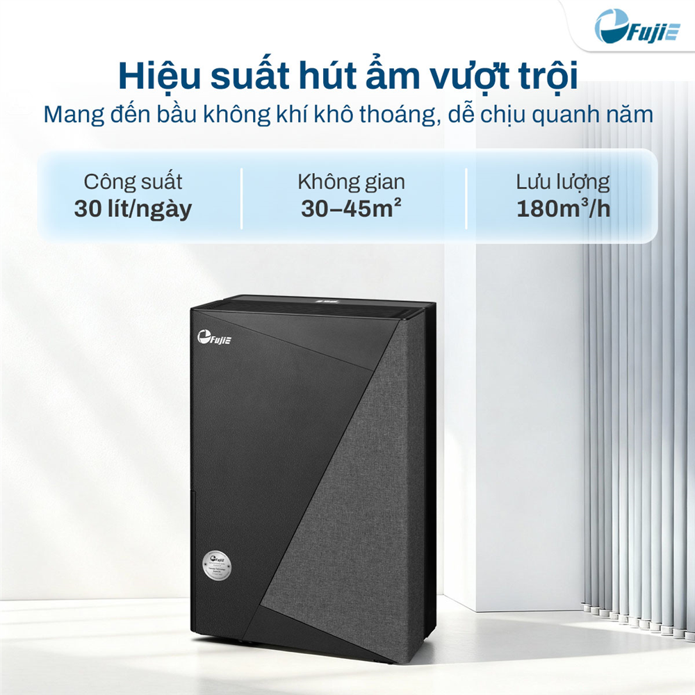 Sở hữu công suất hút ẩm mạnh mẽ lên đến 30 lít/ngày (ở điều kiện 30°C, độ ẩm 80%), Máy hút ẩm FujiE HM-930ED hoạt động hiệu quả trong các không gian từ 30–45m² như phòng khách lớn, khu vực bếp mở hay tầng hầm/gara. Lưu lượng không khí đạt 180m³/h giúp luân chuyển và xử lý độ ẩm đồng đều, nhanh chóng trong toàn bộ căn phòng.